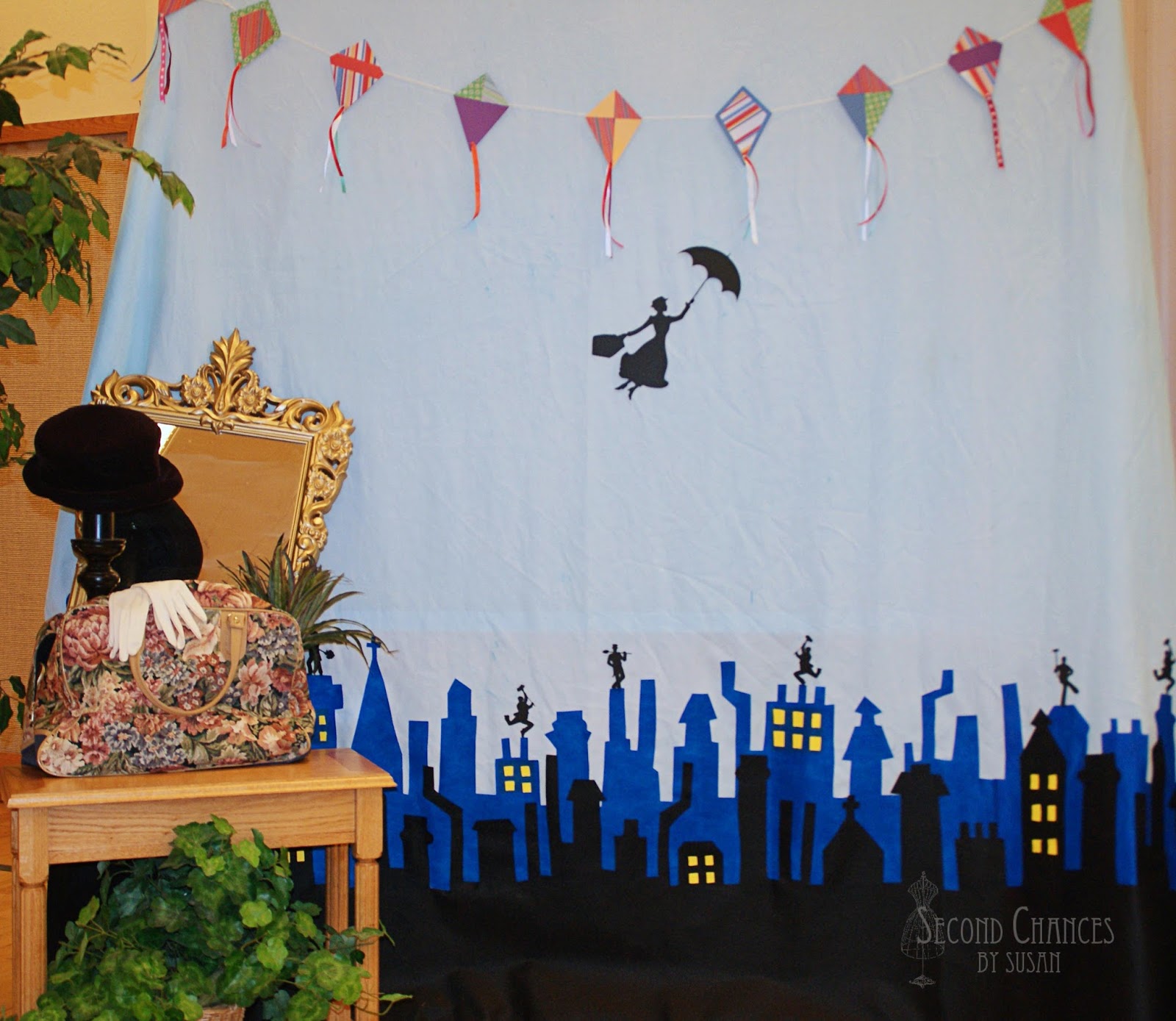 To make the backdrops that flanked our movie screen, I dyed some sheets a nice blue and added a whimsical skyline using blue and black fabric. I purchased the fabric from WalMart for $1.47 a yard. Its lightweight, almost like interfacing, and is at least 60" wide. I just glued it in place with a hot glue gun. The Mary Poppins and chimney sweep silhouettes were cut from black cardstock using my Cricut and adhered with tape. I made a kite bunting from paper and ribbons to add along the top of the backdrops.