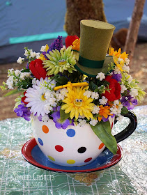 The table was covered with a collection of colorful tablecloths and doilies.  A large teacup centerpiece adorned the middle.  The hat was originally made for my granddaughter's Alice in Wonderland newborn photoshoot.